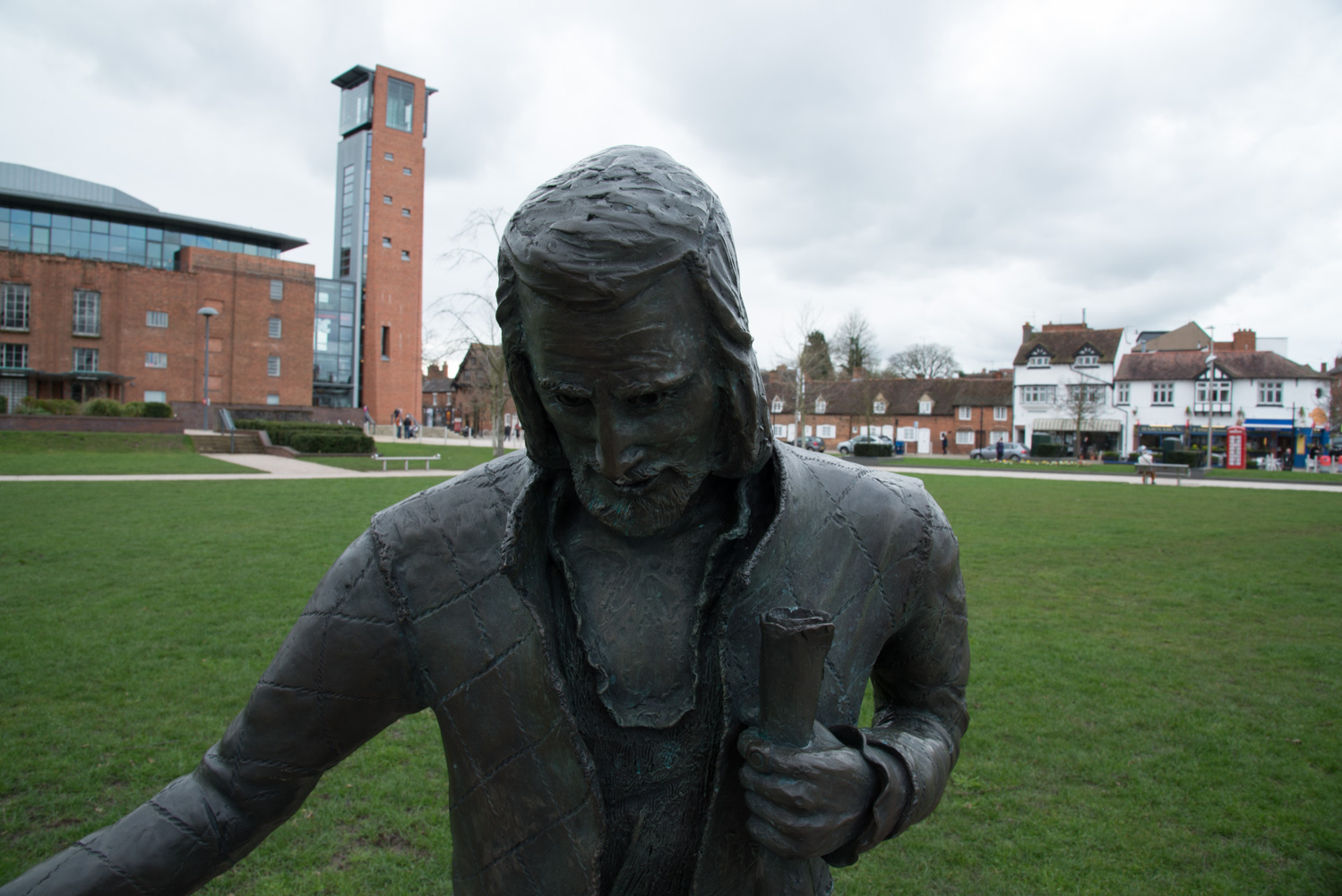 I took these photographs outside the Royal Shakespeare Company in Stratford Upon Avon.  The statue is in the theatre gardens and the scene behind the statue is the Theatre House itself.