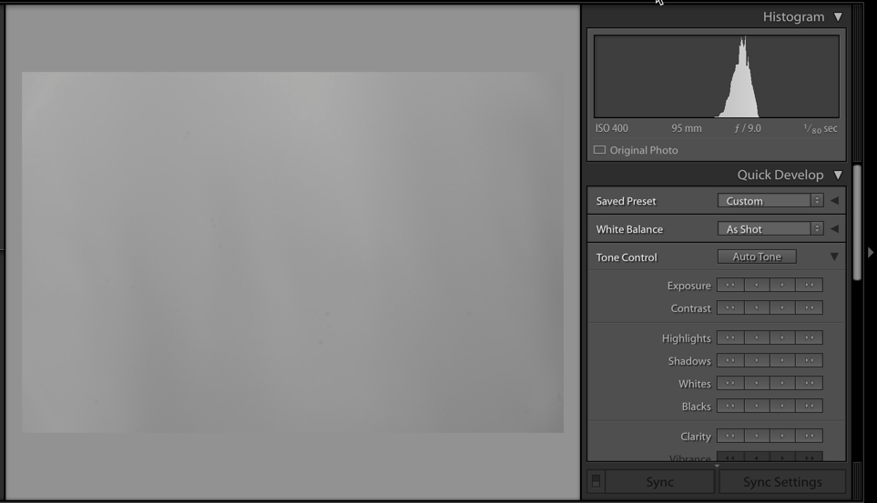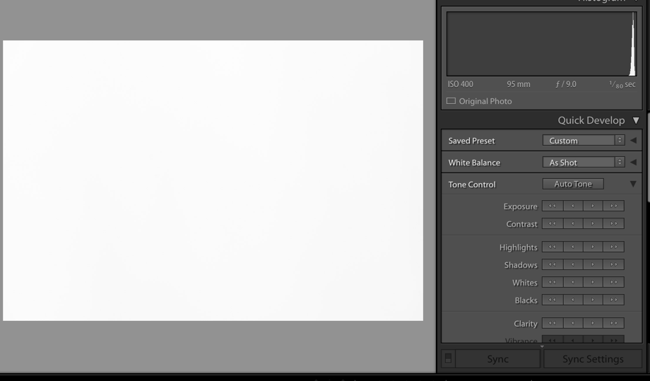 For the white card, I had to slow down the shutter by three stops to place the histogram across to the right hand side. The image shows that the card is now depicted as white.