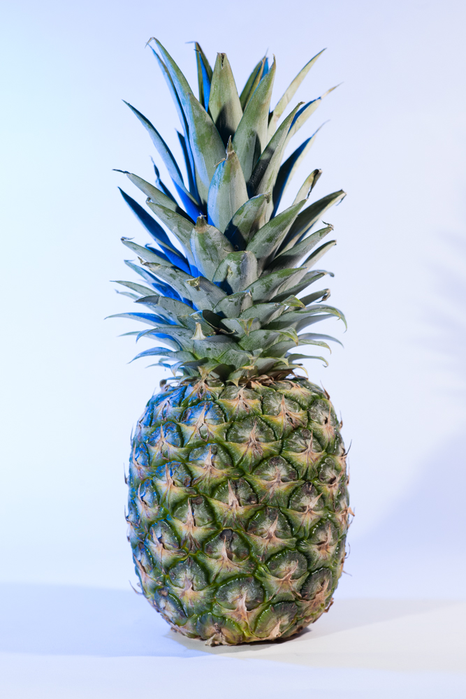 Here I have added a blue gel to the top left flash.  This can be seen on the background and on left hand parts of the pineapple itself.