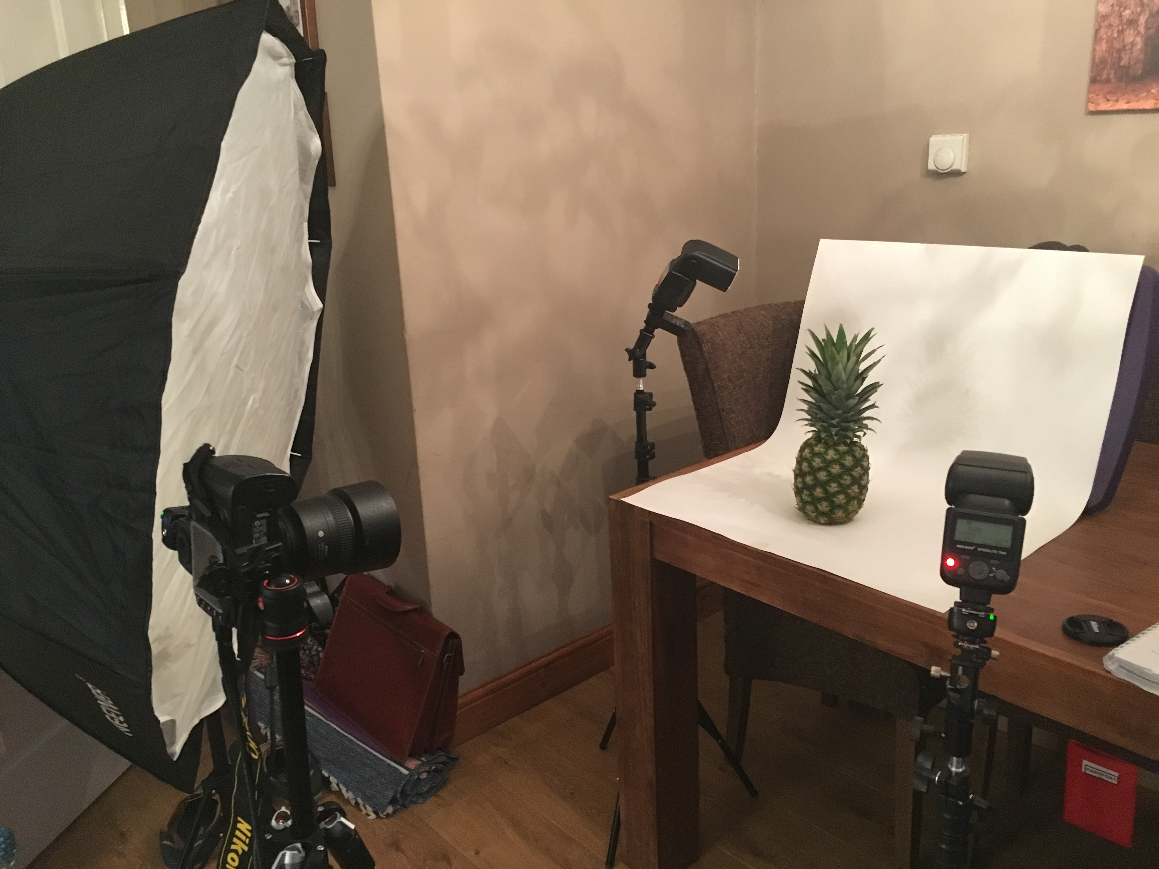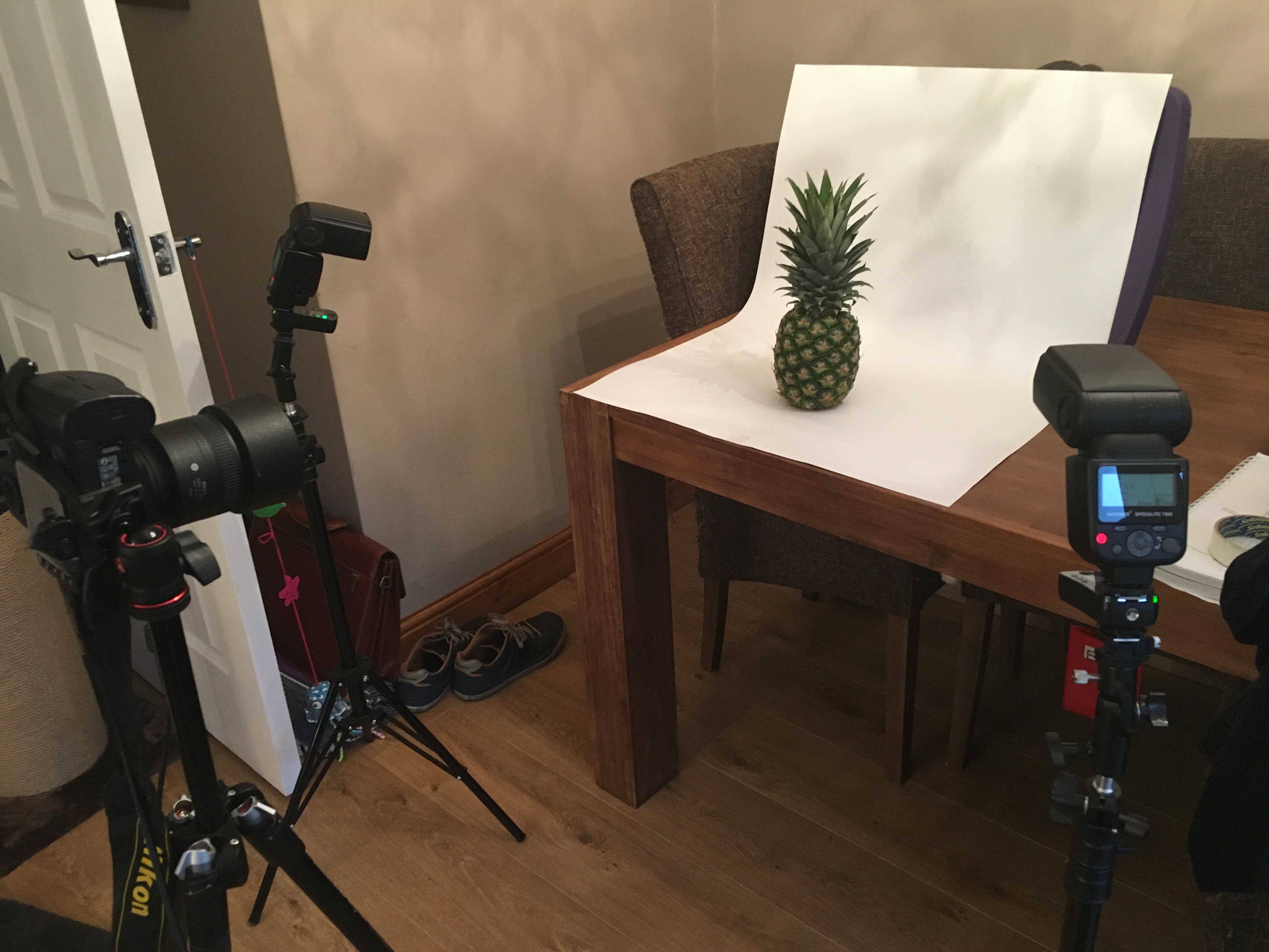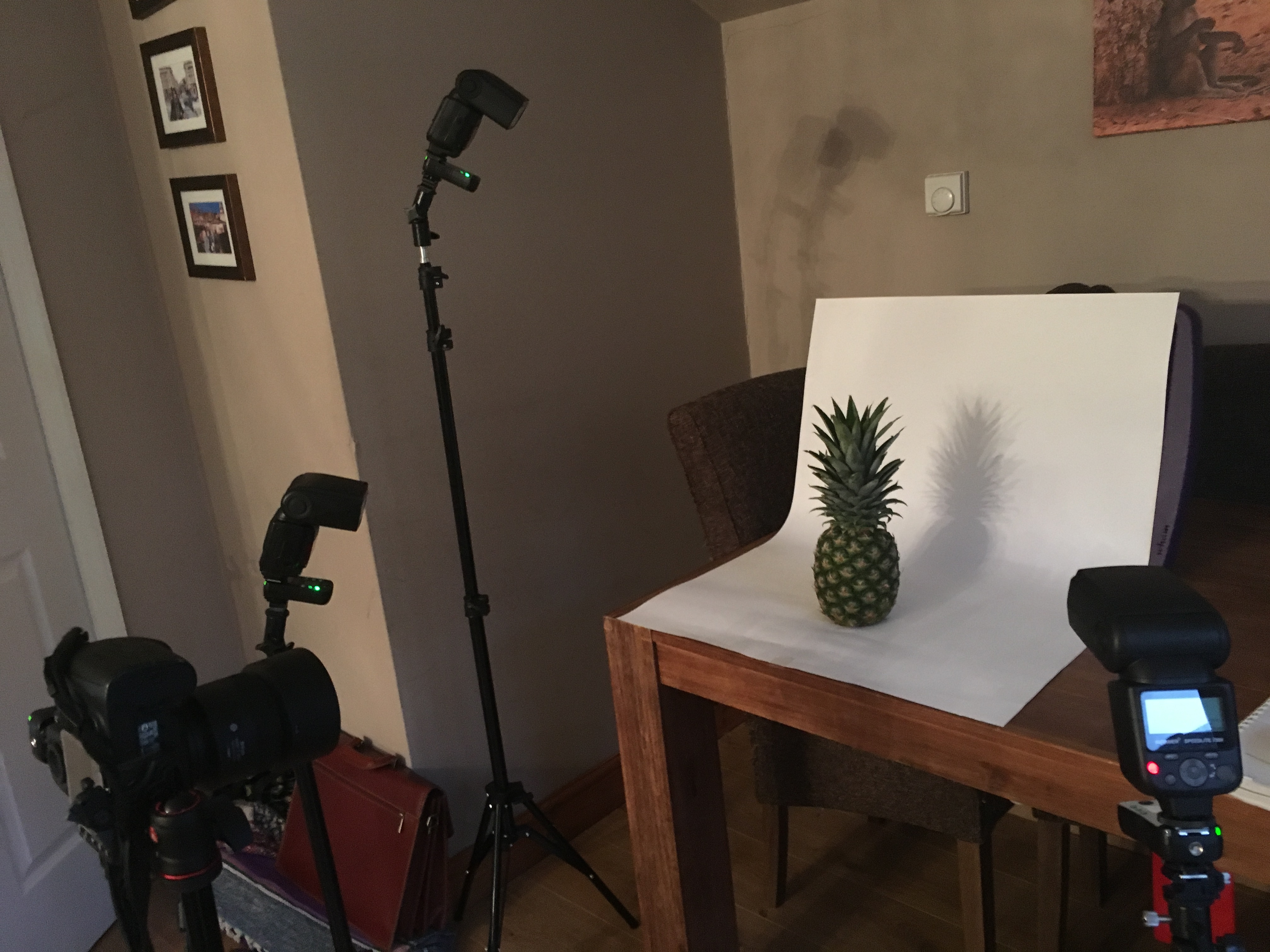 I positioned two speedlights to each side of the pineapple each pointed at a 45 degree angle towards the pineapple.    I used radio triggers fitted to the camera and to each flash. Each flash was set to manual mode so that I could be in control and adjust the power setting of each flash as I progressed through the shoot.