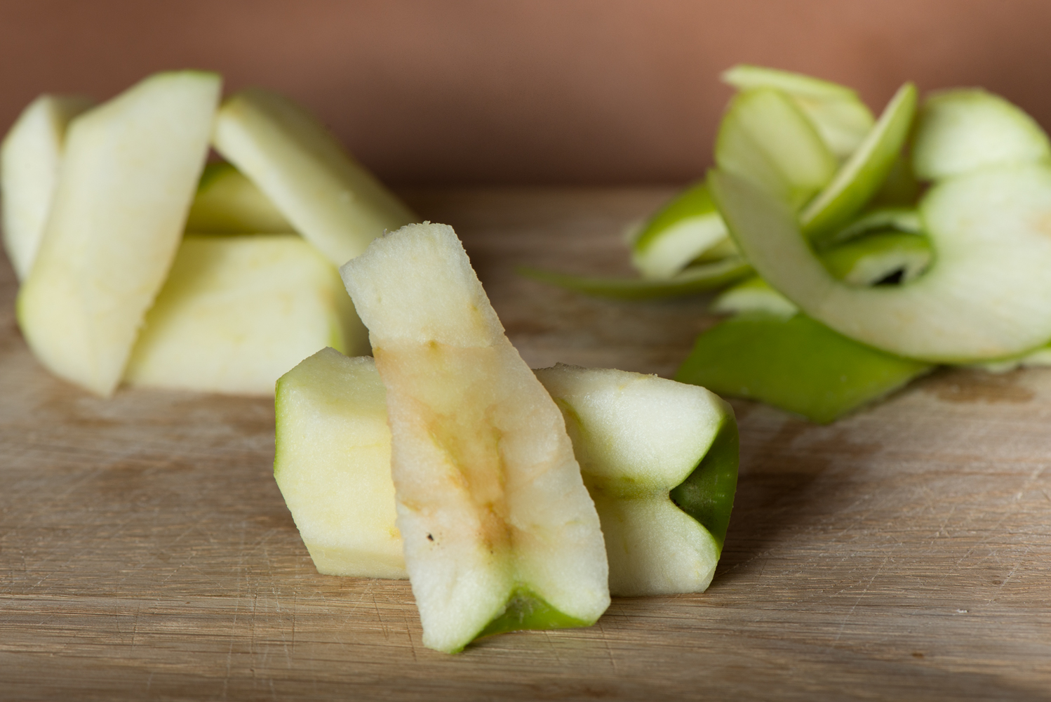 The inspiration of my idea was not of framing, detailed study or juxtaposition, it came from eating at a nice restaurant. It is fashionable at the moment to serve dishes ‘deconstructed’. After having eaten a deconstructed apple pie, I decided to simply this even further and capture an image of a deconstructed apple.