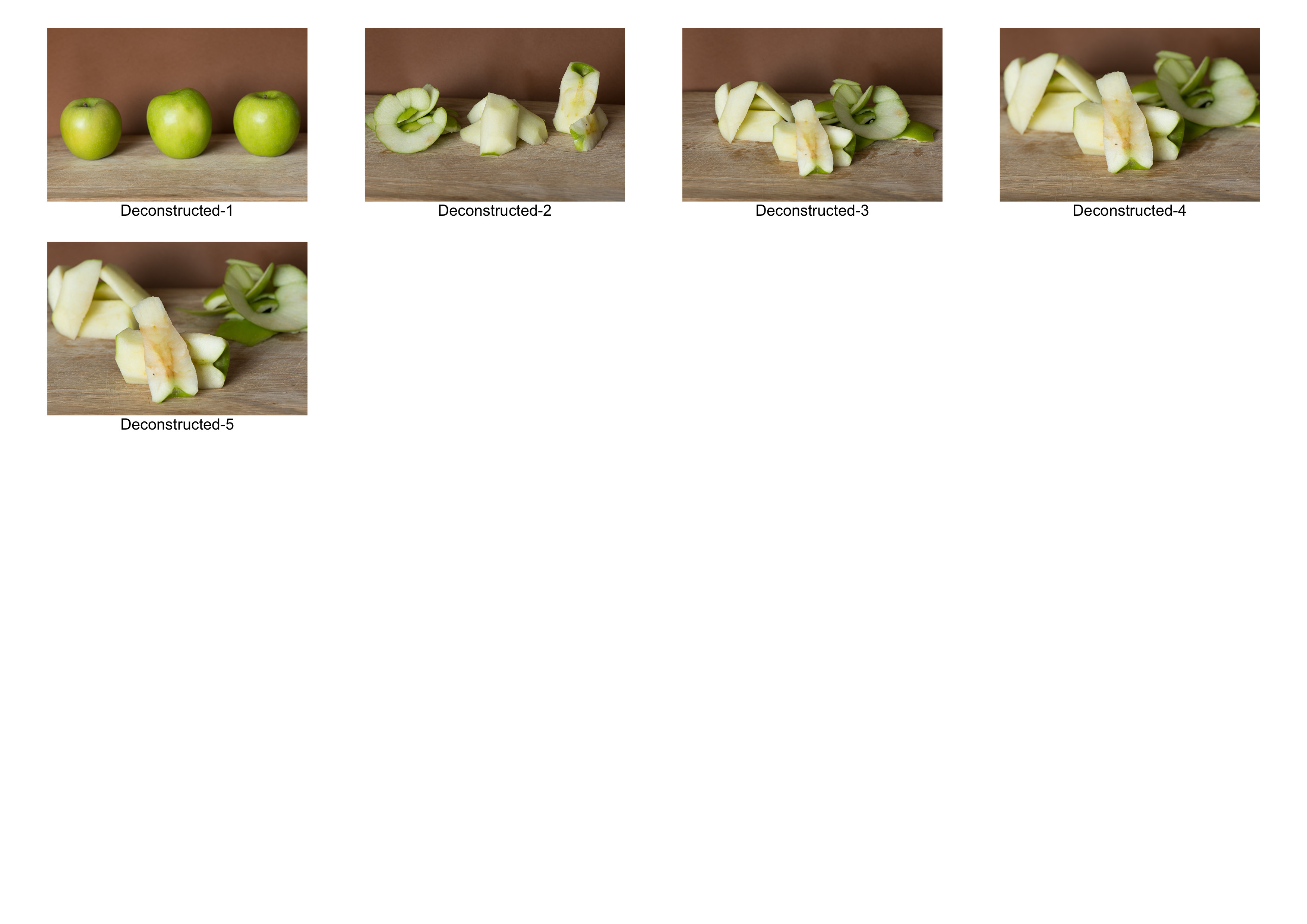 The contact sheet shows a few of the images including one of three apples. This shot was used to get the lighting and setup right as I realised that a deconstructed apple was going to go brown pretty quickly once peeled.